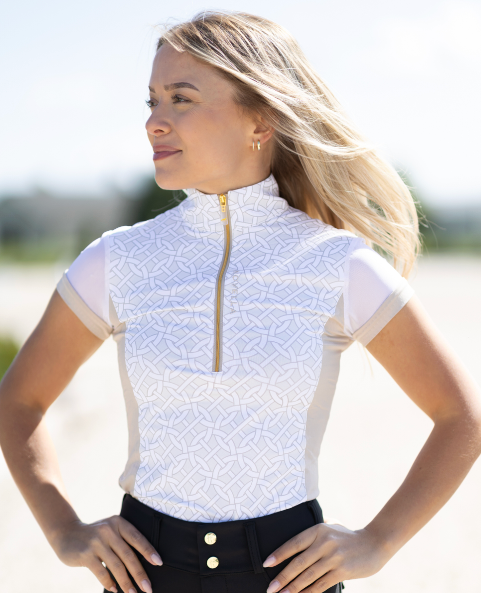 INSPIRED BY QUIL, a homebred horse whose heart of gold (and small stature) has overcome endless and serious health issues with his 'trier' mentality. Quil's comeback and journey to the Grand Prix continues to wow everyone in the big rings, and this beautiful Novella shirt will do the same. The Quil Short Sleeve style features a full mesh cap sleeve with contrasting details on the side panels, cuff and collar. The 'proper tan' color can be worn with any color breech and screams sophistication. It features the signature NOVELLA embroidery down the deep gold quarter-zip for an ultra flattering fit.