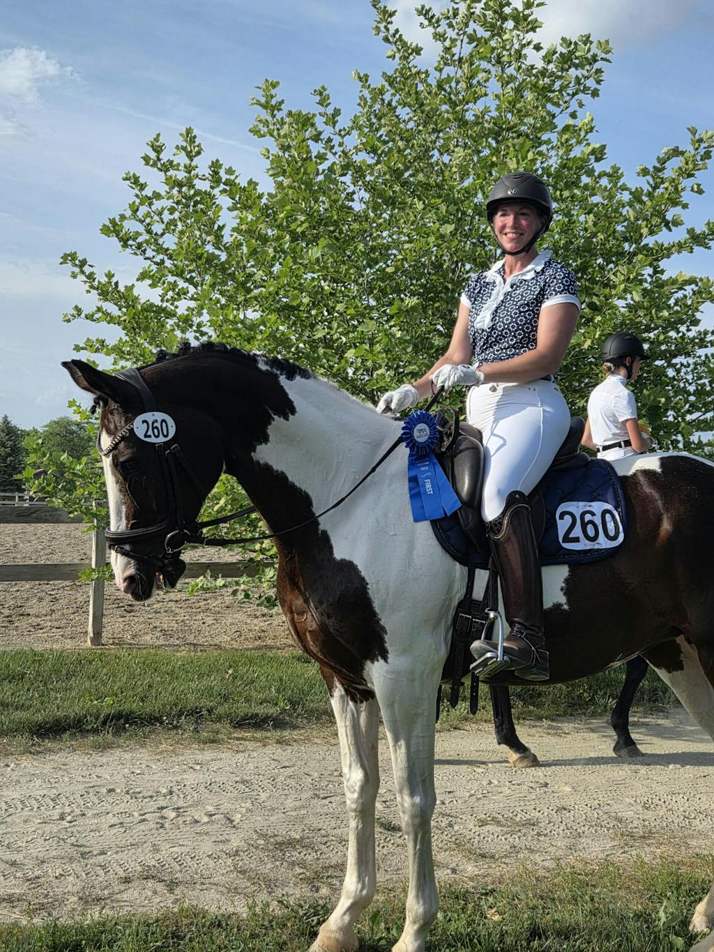 INSPIRED BY SANCEO, a Hanoverian stallion known for his successful dressage career, particularly the Tokyo Olympics with his mount Sabine Schut-Kery. The Sanceo Integrated Collar Show Shirt is US Equestrian Approved as a show shirt -- say goodbye to pesky stock ties! This is approved if coats are waived as well. This style features silver embellishments - just like the Silver Medal he earned at the Olympics. The 'blue ribbon blue' & black geometric pattern, bling collar and contrasting collar gives you a standout look for schooling, use of a showshirt and more.