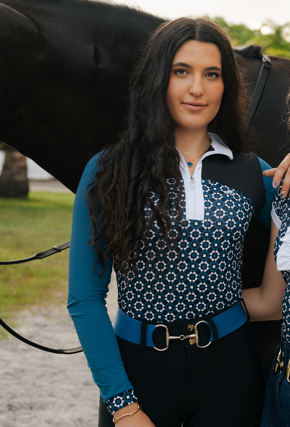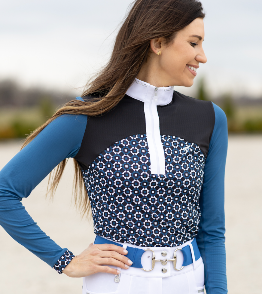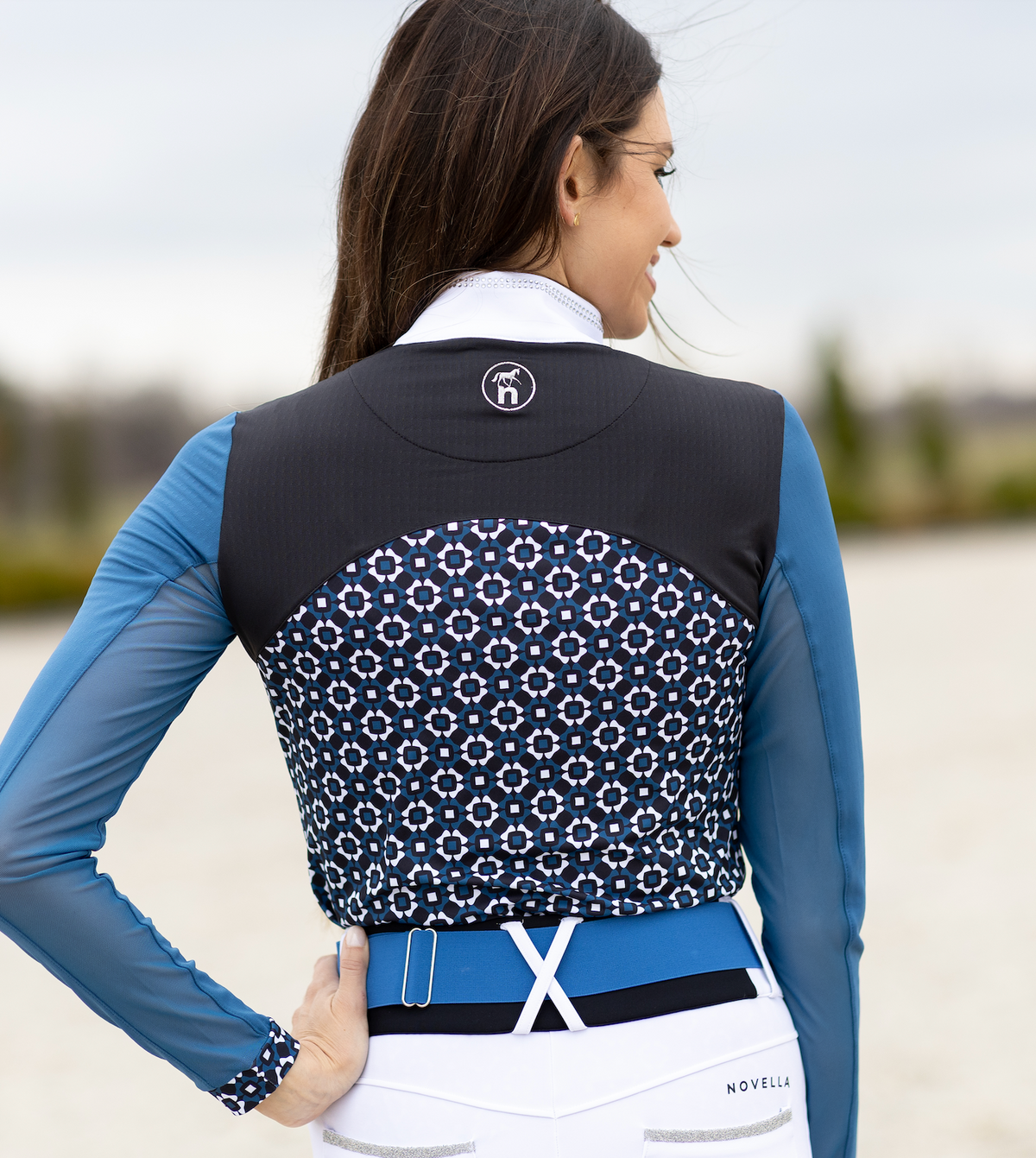 INSPIRED BY SANCEO, a Hanoverian stallion known for his successful dressage career, particularly the Tokyo Olympics with his mount Sabine Schut-Kery. The Sanceo Long Sleeve style features silver embellishments - just like the Silver Medal he earned at the Olympics. The 'blue ribbon blue' & black geometric pattern, bling collar and contrasting collar gives you a standout look for schooling, use of a showshirt and more. Throw a stock tie over & a jacket, and you're ready to go in the show ring.