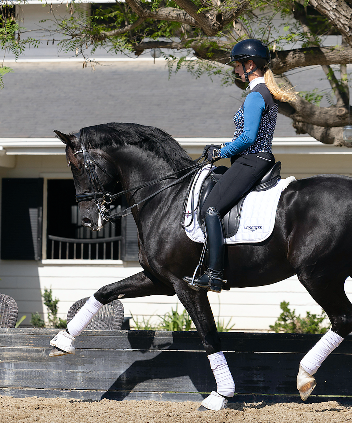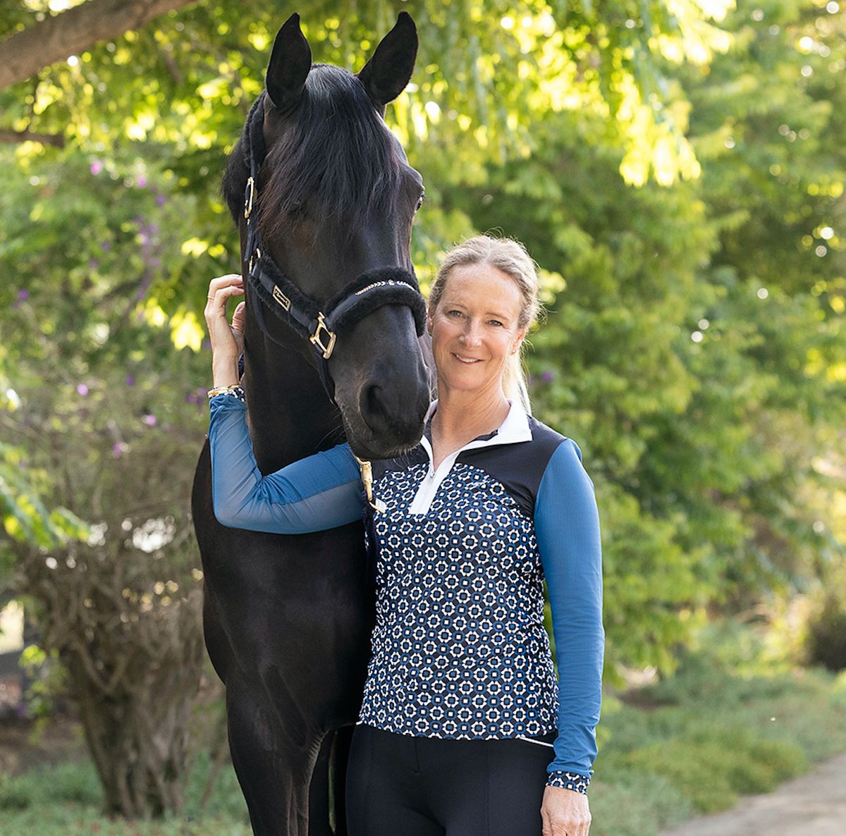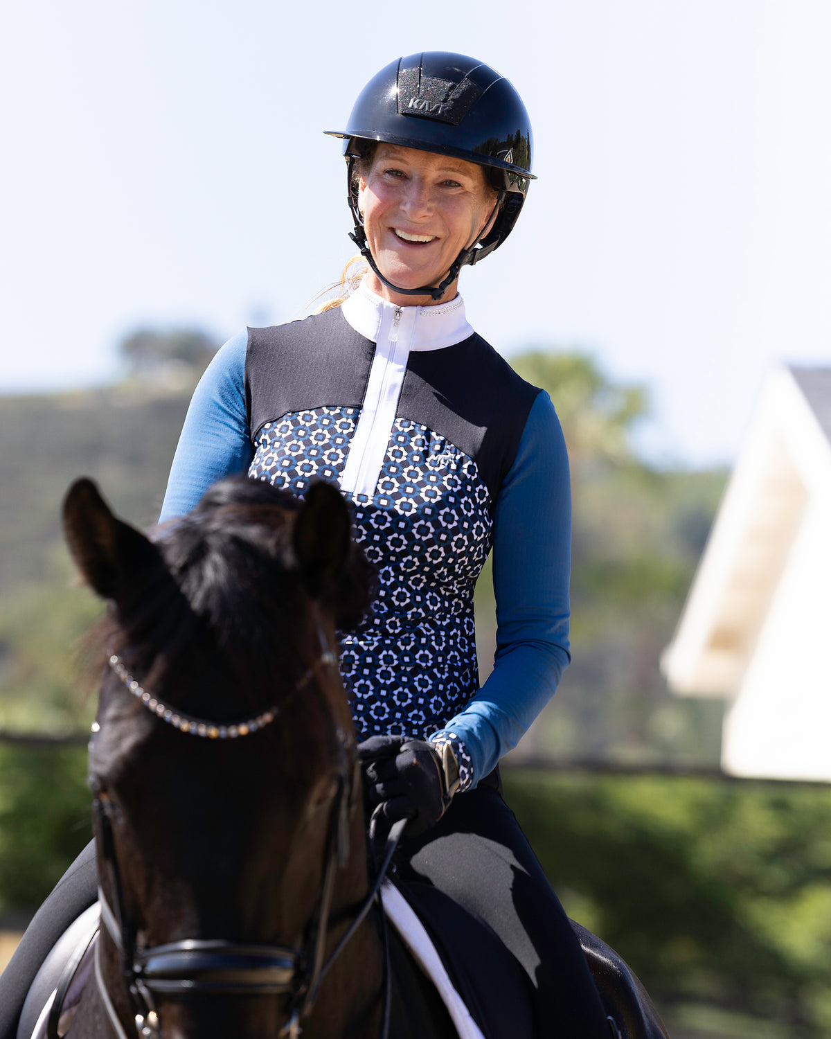 INSPIRED BY SANCEO, a Hanoverian stallion known for his successful dressage career, particularly the Tokyo Olympics with his mount Sabine Schut-Kery. The Sanceo Long Sleeve style features silver embellishments - just like the Silver Medal he earned at the Olympics. The 'blue ribbon blue' & black geometric pattern, bling collar and contrasting collar gives you a standout look for schooling, use of a showshirt and more. Throw a stock tie over & a jacket, and you're ready to go in the show ring.