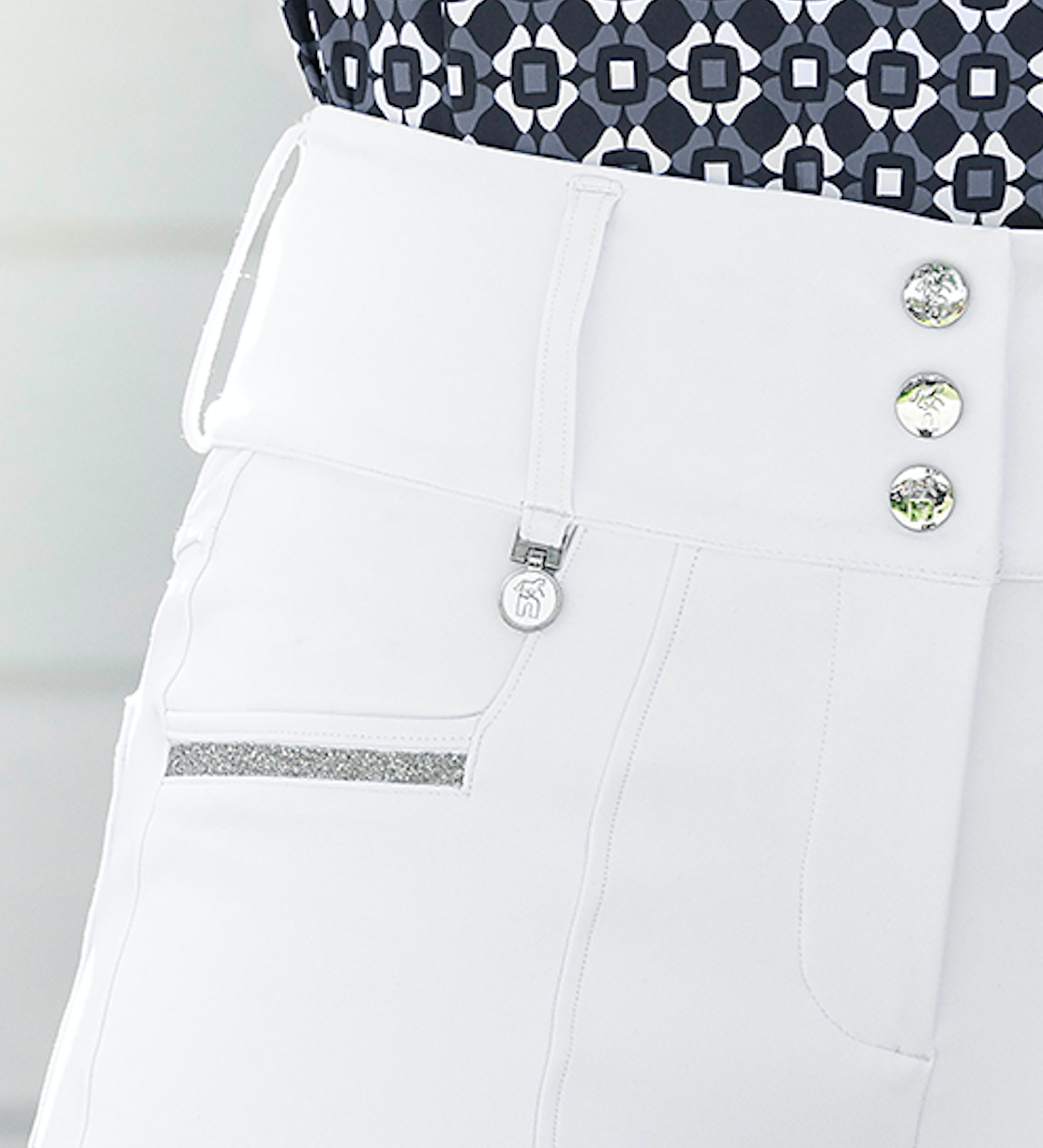 Say hello to your new favorite show breeches -- and they're water repellent! High-waisted with a charcoal gray seat, The Showstopper Breeches feature an elegant high rise in breathable and stretchy fabric -- perfect for all year round use. With low-profile but stylish silver bling detailing on the front, these have super handy deep pockets on the leg and a full silicone seat panel. Say bye to pocket pouches for a cleaner competition look!