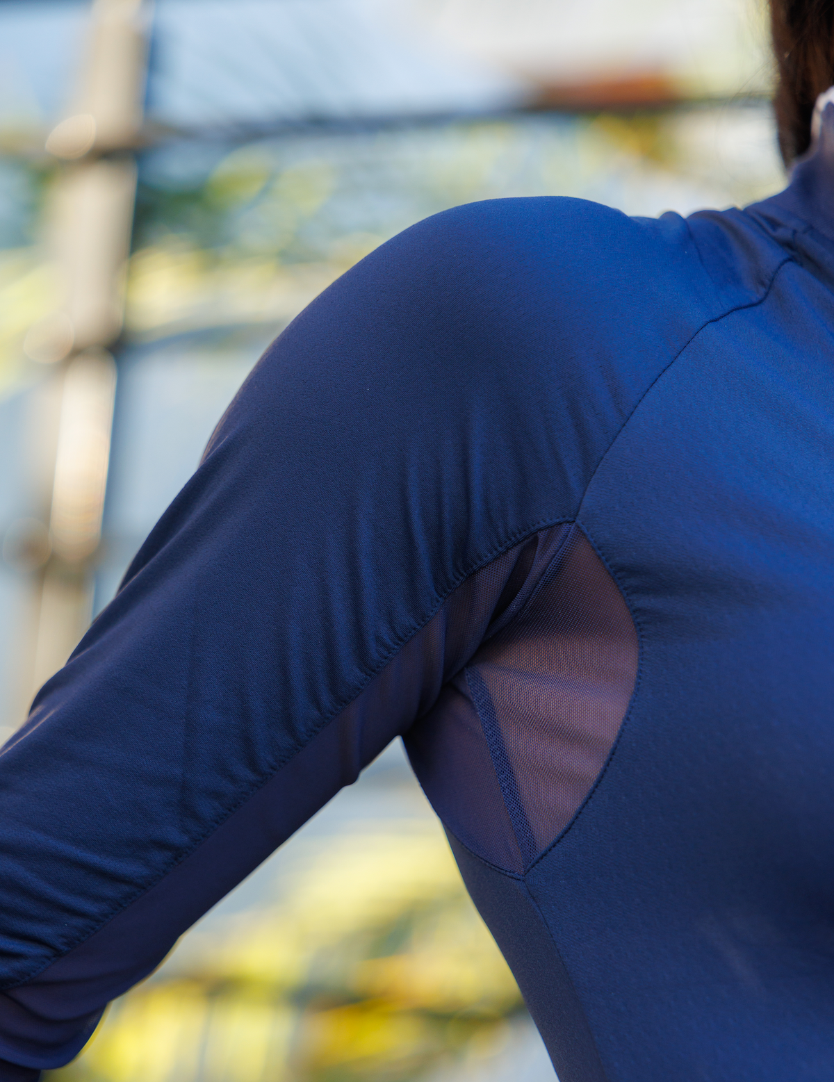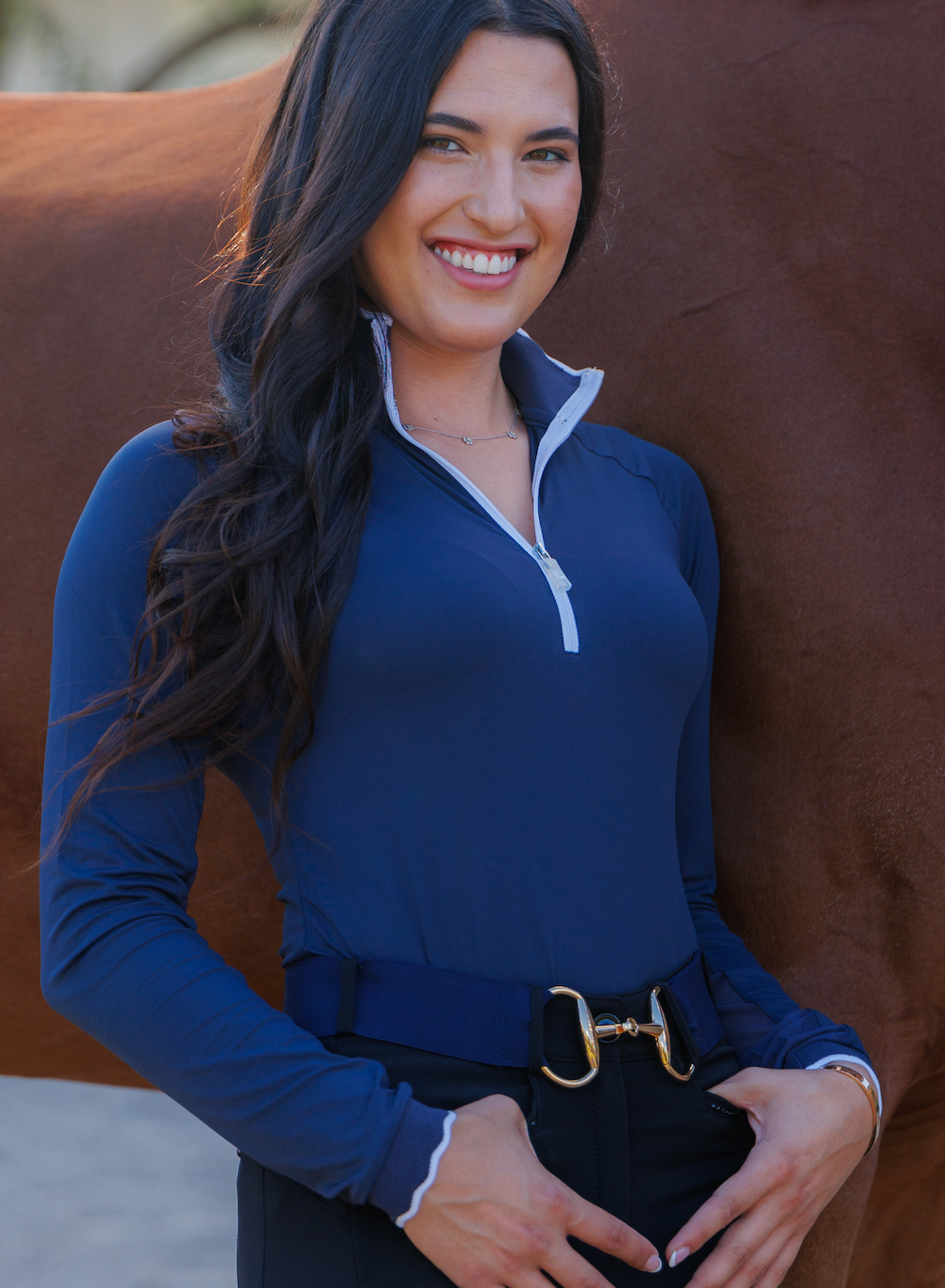 THE BARN SHIRT (Long Sleeve), available in navy or black. This 'plain' Novella Equestrian shirt goes with everything. The Barn Shirt (Long Sleeve) features an adorable scallop neck and cuff, a mesh under-sleeve and under-arm and white zipper. This shirt is also perfect for adding your barn or trainer branding since it features minimal Novella logos.