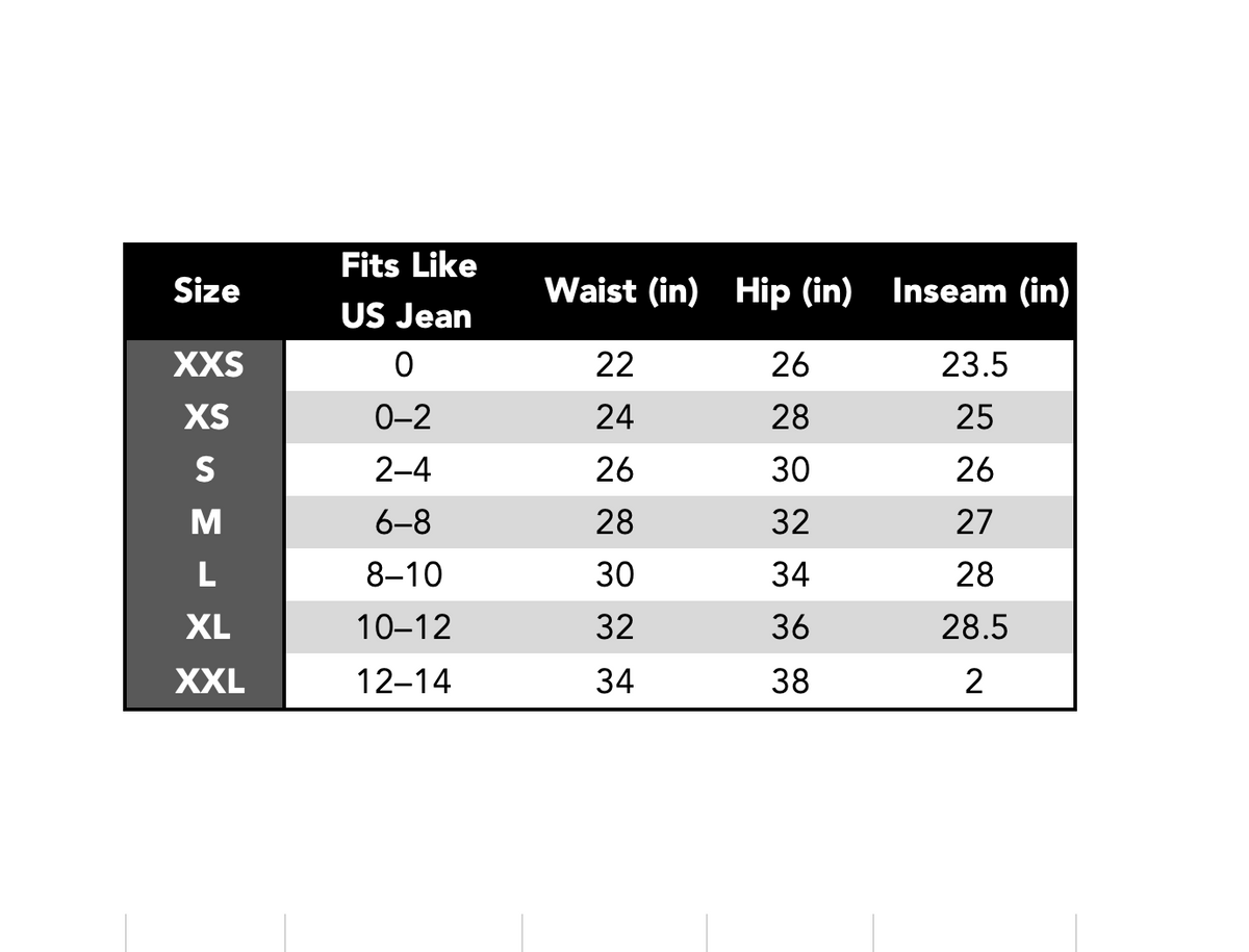| Size | Fits Like US Jean | Waist (in) | Hip (in) | Inseam (in) |