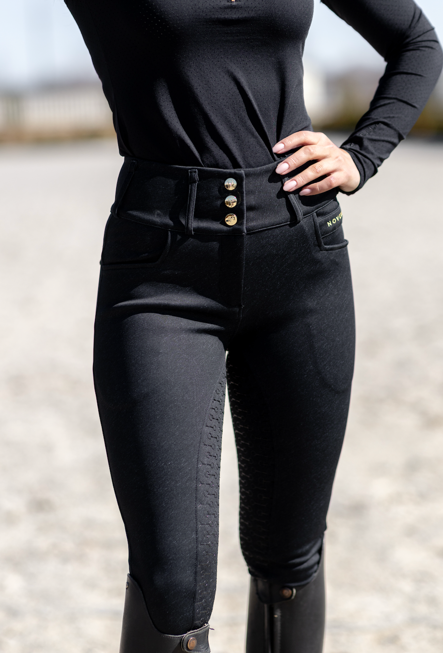 THE FIRST OF ITS KIND! This is a faux Jean material that is flexible and comfortable to accommodate for any weight fluctuations. The jean color can be worn with anything – and gives you freedom without the rigidness or stretched out look of jean material. It holds its shape all day long, after many horses, and flatters your figure. The Perfection Jean Breech perfectly molds to your body while smoothing imperfections with a bit of compression. There is a snaffle design on the full-seat that gives you just the right amount of grip, embossed Novella gold buttons and ultra-deep pockets for your phone. They also accommodate room for a 2 inch belt. These are more substantial than the Always Fits Breech for year round comfort.